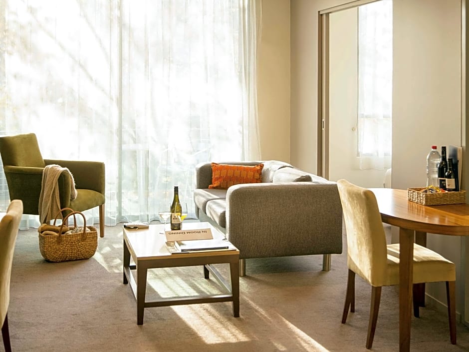 This spacious suite features a private balcony, a kitchenette and a bathroom with a deep bathtub.